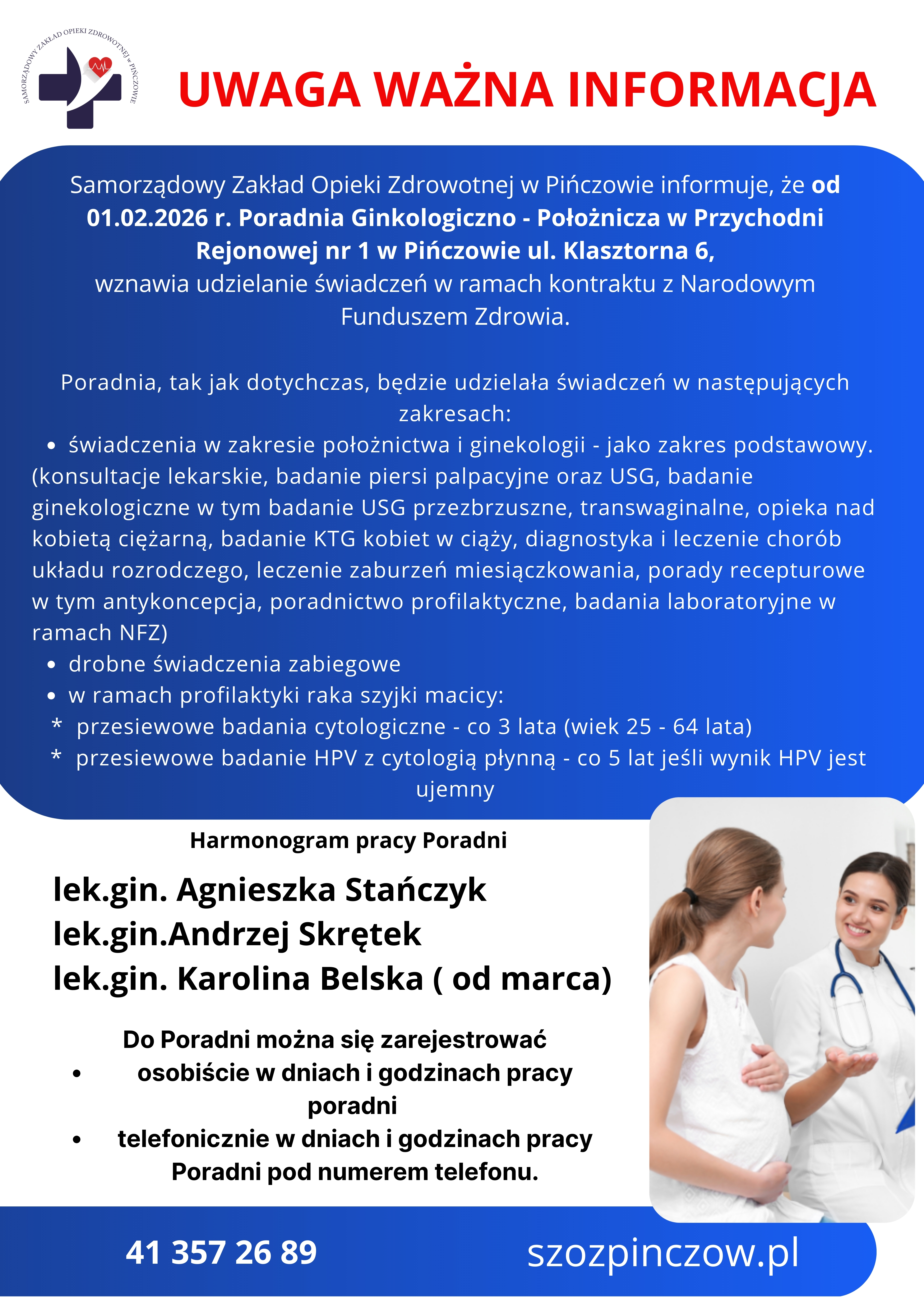 Informujemy, że od 01.02.2026r. Poradnia Ginekologiczno - Położnicza w Przchodni Rejonowej nr. 1 w Pińczowie